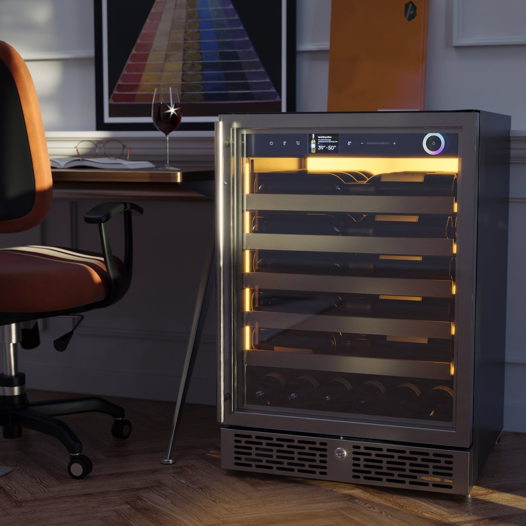 A: This stylish 41-bottle single-zone wine cooler features a stainless steel finish and Vinoglow illuminated glass door for a modern touch.