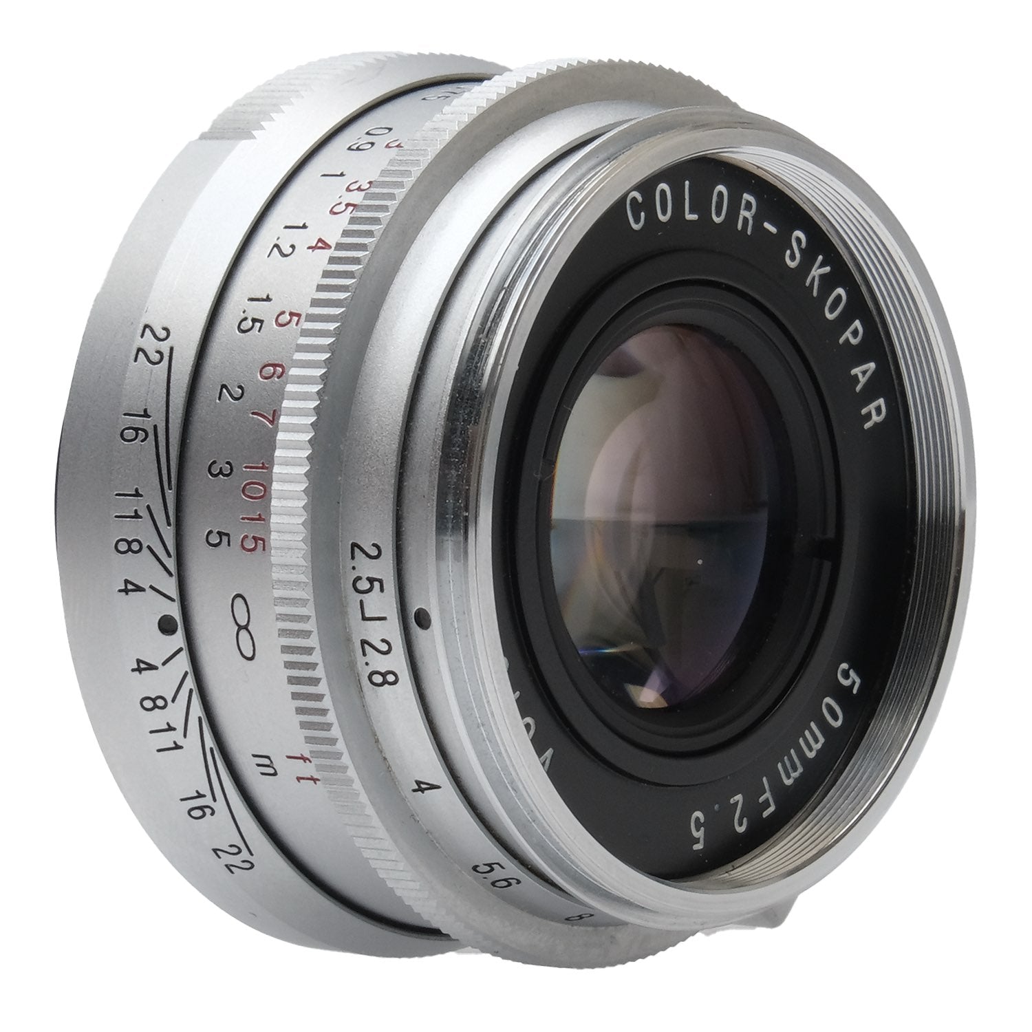This Voigtlander 50mm f2.5 Color-Skopar Lens (Silver), #9220576, is in great condition with minor handling wear. I rate it cosmetically a (9). The focus ring is smooth, but the aperture ring is a bit stiff. The aperture functions properly, and the glass is clean and clear with no haze, marks, or fungus. There are a few faint specks of dust inside, but they do not affect image quality. This lens includes front & rear caps. It is for Leica screw mount/thread mount (LTM) and other E39 bodies. Please refer to the photos for details.