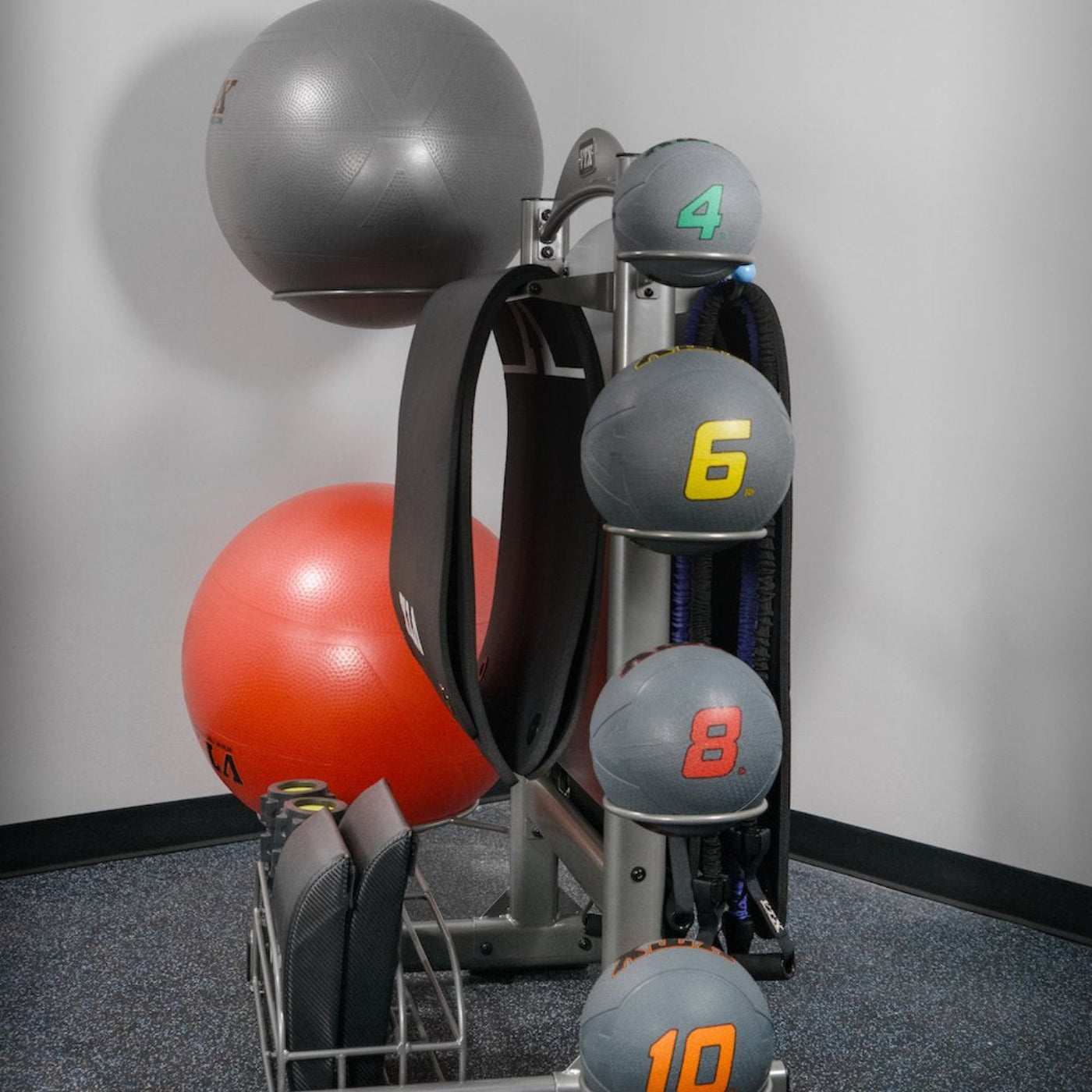 The VTX Light Accessories Rack in Medium (52" H) offers a compact storage and organization solution to store small light fitness accessories. Made for versatility, the rack stores stability balls, medicine balls, covered resistance bands, ab mats, foam rollers, and exercise mats. Similar to the large version, the medium rack includes a premium acrylic panel for storing resistance bands and has the option of being customized with a custom logo.