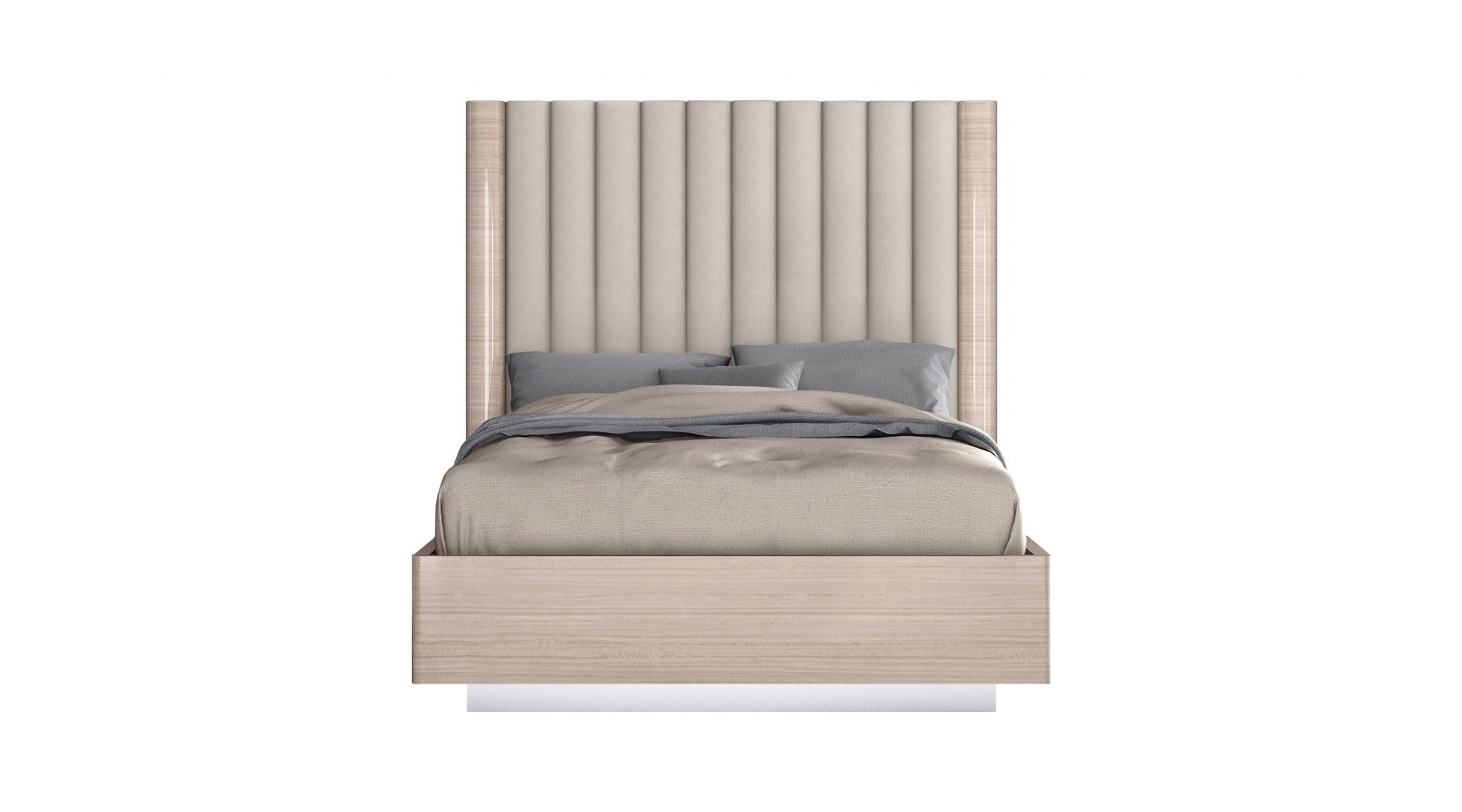 - Waves Bed Full, High Gloss Beige Angley Frame, Upholstered Panels in headboard in Beige Fabric, Stainless Steel Legs