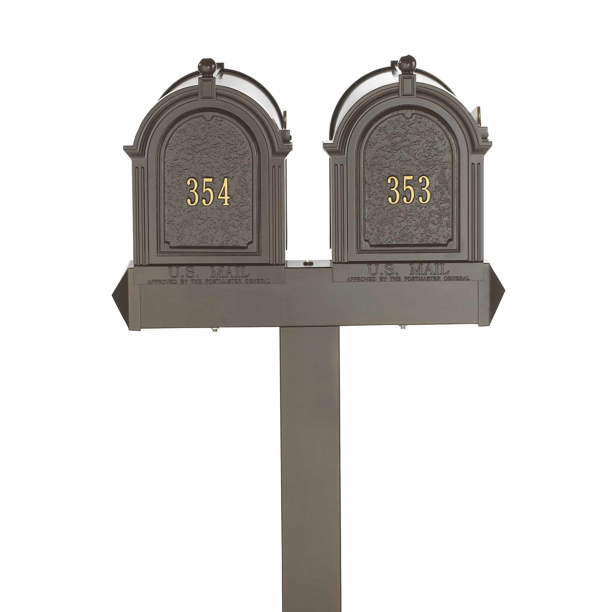 The Whitehall Multi Mailbox Dual Capitol Package with personalized door plaques features the capitol mailbox made from sand cast high-density aluminum is 20% larger than your standard mailbox. Magazines lay flat in the generous interior. This dual mailbox is approved by Postmaster General.