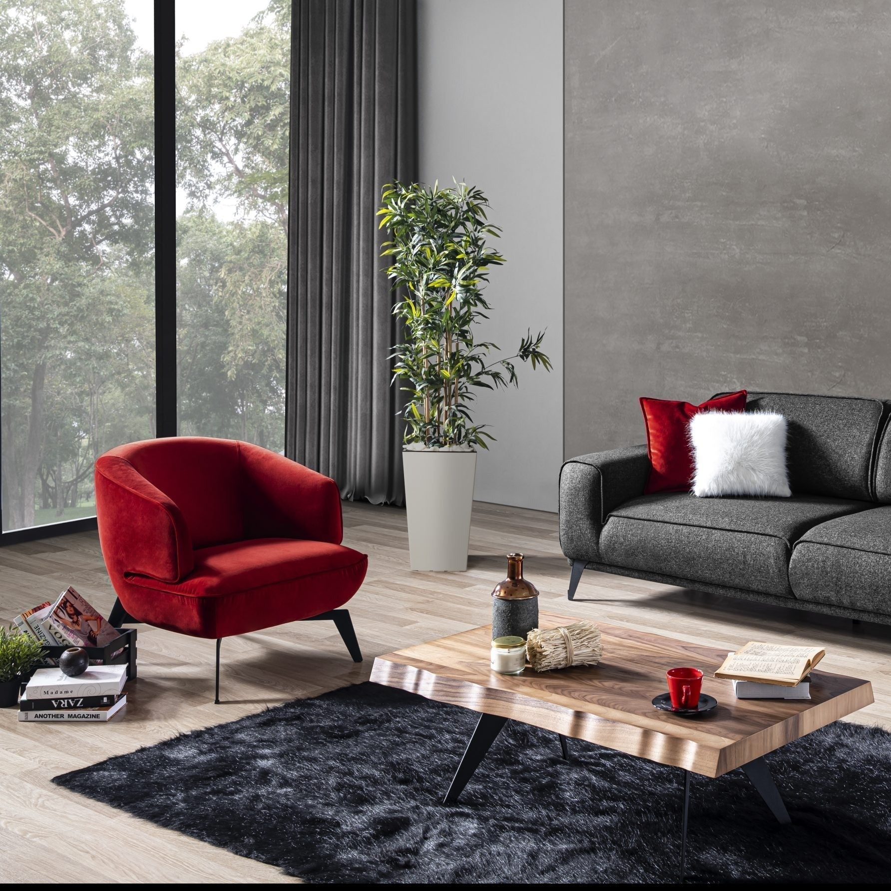 Mersin Accent Chair comes in red velvet fabric and matte black powder-coated metal legs.