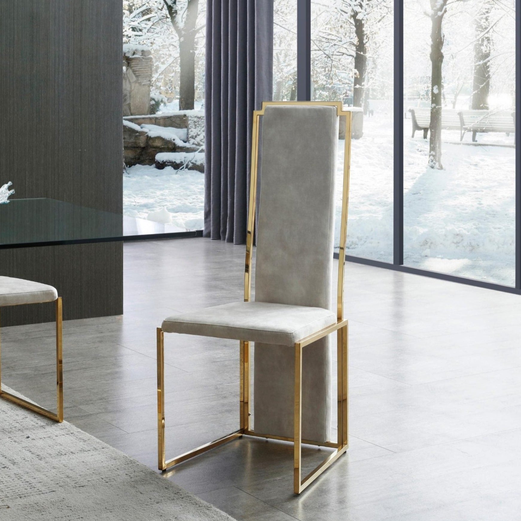 A: This dining chair features soft beige upholstery, a sturdy frame, and a modern, minimalist design that suits a variety of dining settings.