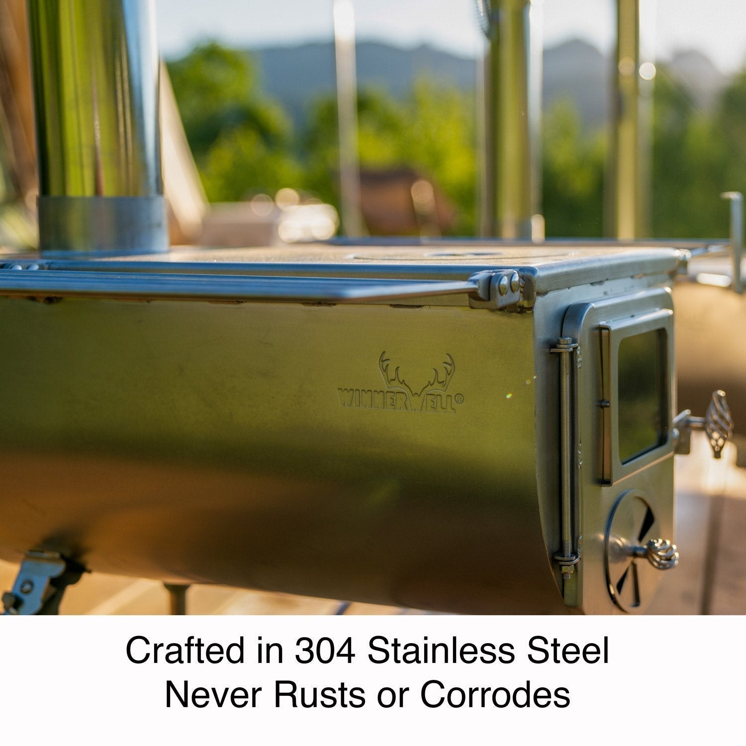 The Winnerwell Woodlander Large delivers everything you need from a portable wood-burning stove. With a classic round belly shape, it is deep enough to accept standard size split firewood and the 3 spring-loaded legs fold flat for transport and quickly deploy for stability on uneven surfaces. The durable 304 stainless steel construction performs in harsh outdoor environments. An ideal stove for use in compatible hot tents and for outdoor cooking utility.