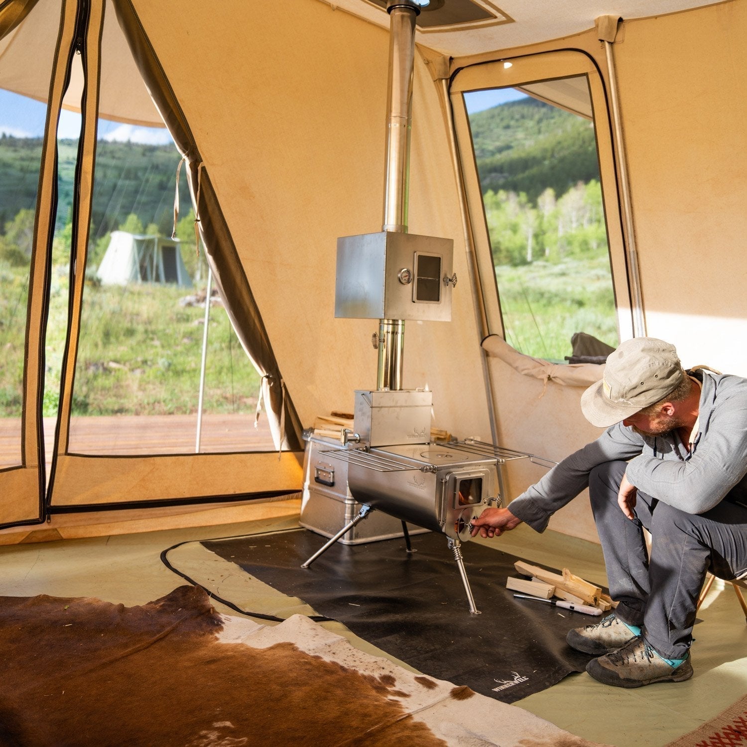 Efficient and proper use of a wood stove requires some patience and practice. When starting your fire, it’s important to quickly establish a hot bed of coals to initiate a strong draw of air through the stove and up the flue. Use a generous amount of small tinder when starting a fire in the stove, slowly adding larger pieces of wood. Always open the door slowly to prevent smoke spillage into your tent or shelter. Never start a fire using flammable accelerates such lighter fluid. We strongly recommend operating your stove outside for the first several burns to practice your fire starting technique and optimizing burn temperature and rate using the airflow controls. It’s important that your stove burns hot enough to efficiently combust the fuel- when the stove is burning efficiently, little to no visible smoke should be exiting the chimney pipe. If the chimney is belching thick visible smoke, this is an indication the stove is not burning efficiently. Also avoid overloading the stove with fuel as this can create excessive heat which can warp or damage the stove.