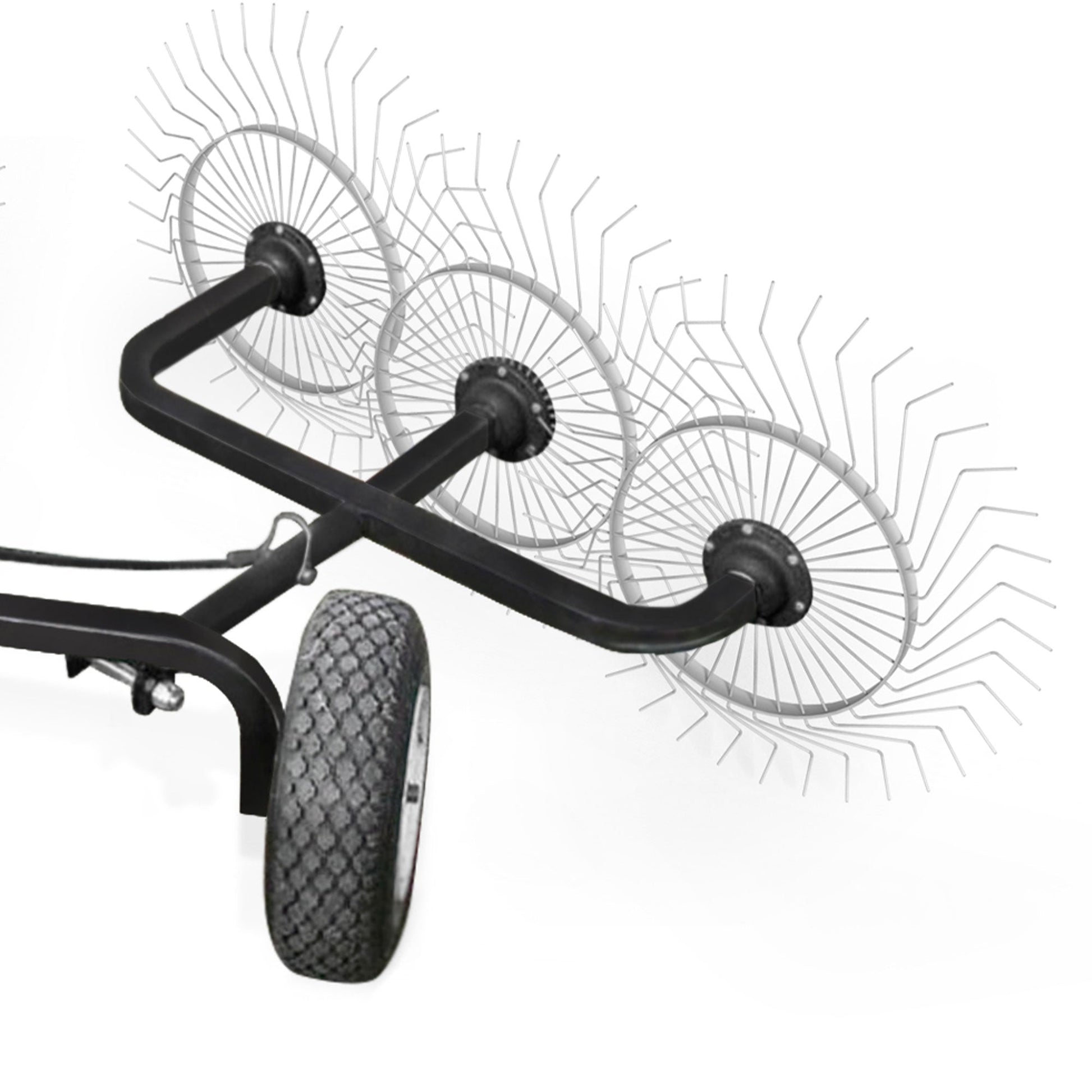 Attaching is easy with a pin-style hitch to your ATV, UTV, or utility tractor. The V-style design and 5-foot wide working path allow you to quickly handle large areas. The (6) 20-inch tine reels are specially designed with built-in bearings for smooth operation. The tine reels are reversible for extended use and the reel arms can be raised and lowered manually. The reel arms can also be lifted separately for windrowing. With 12-inch pneumatic tires, this rake can travel easily over any tough terrain, whether it is your lawn, garden, or field. These rakes are made with heavy-duty, 1-inch tubular steel, making the items a strong pull behind rake for ATV, UTV, or utility tractor. To add even more convenience for the user, this Acreage Rake has a special design, allowing the tine arms to be removed for compact storage. All these features make it one of the best lawn and garden equipment. The dimensions of the product are 32 inches long, 60 inches wide, 60 inches tall, and the product weighs 77 pounds.