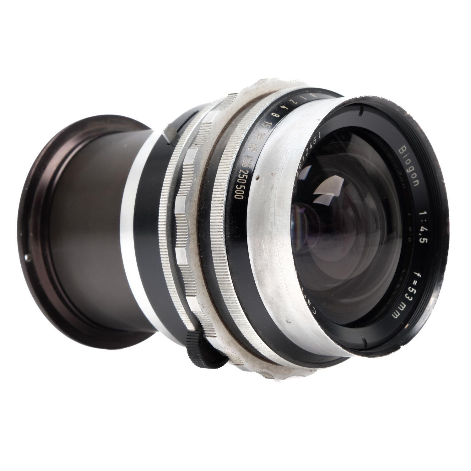 This Zeiss 53mm f4.5 Biogon lens, #2612461, is in average condition with average edge wear on the front from external mount accessories. I rate it cosmetically at (8+). The shutter is accurate at all settings and the aperture works properly. The glass has no haze or fungus, but there are coating marks on the glass. . This lens should still make some great images and is ready for your next project.