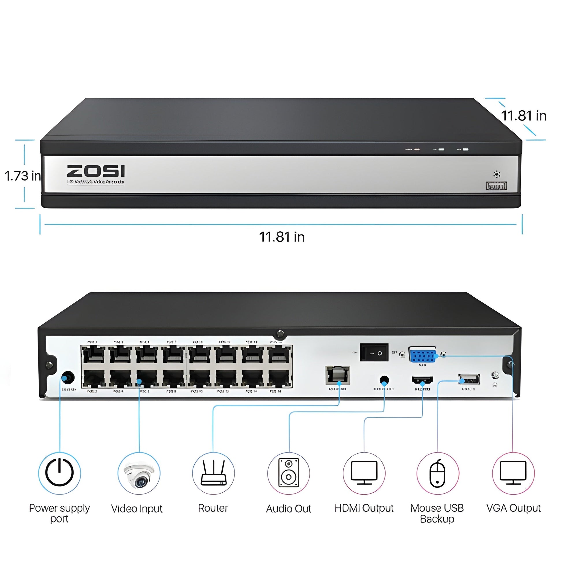 The Zosi 4K 16-Channel Network Video Recorder (NVR) with a 4TB Hard Drive is a powerful security solution for large-scale surveillance systems. Here’s why it’s an excellent choice: