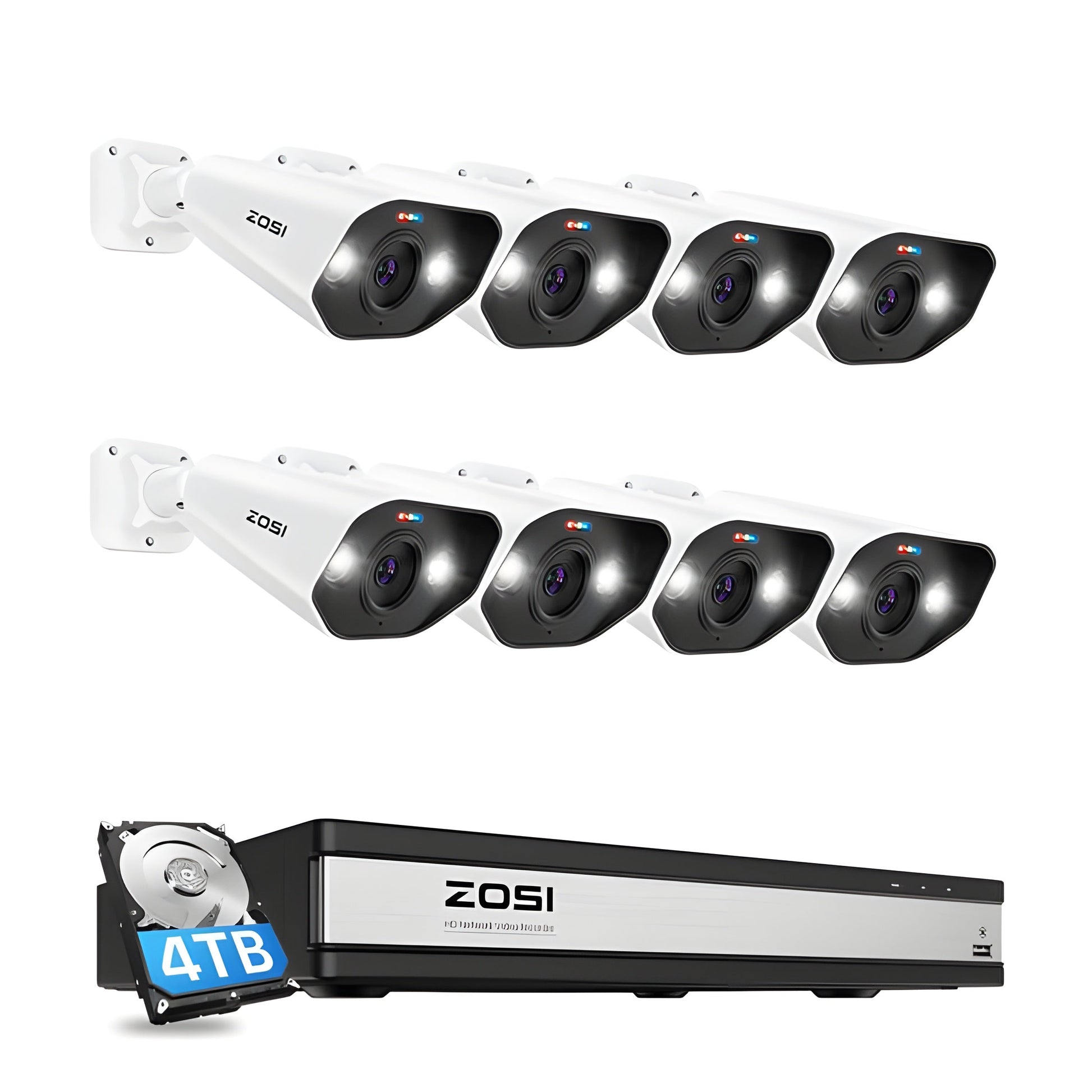 A: The Zosi C182 system includes 8 high-definition 4K cameras with spotlight-enhanced color night vision, AI-powered person and vehicle detection, and a 4TB hard drive for secure storage. The system supports up to 16 channels, allowing you to expand to 16 cameras for broader coverage.